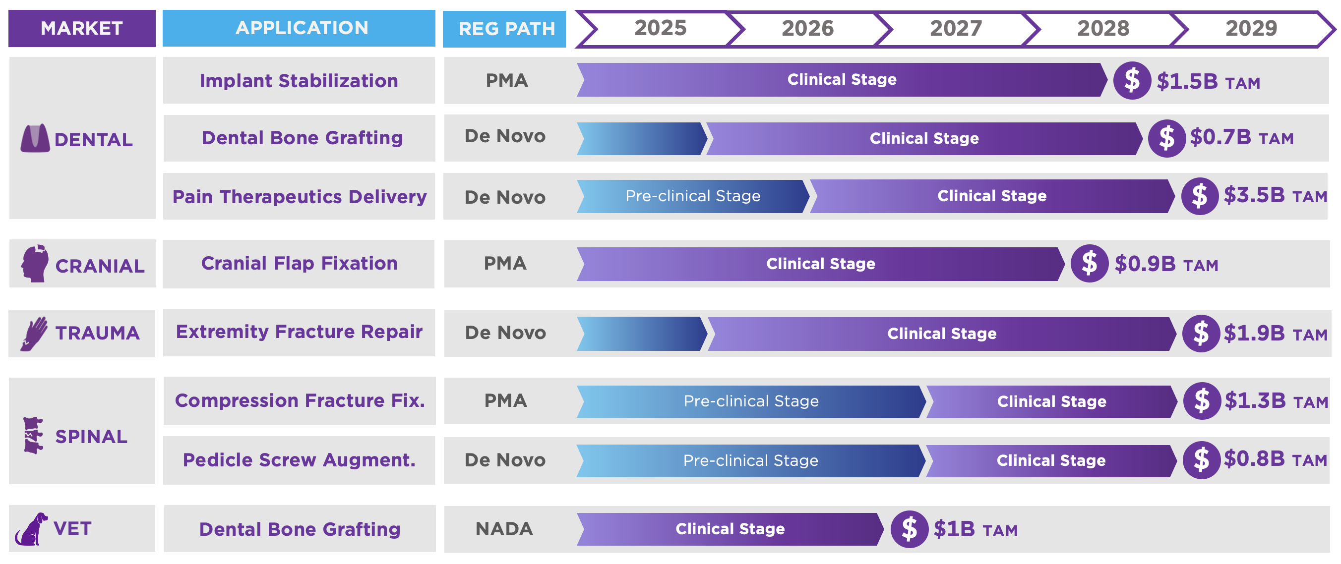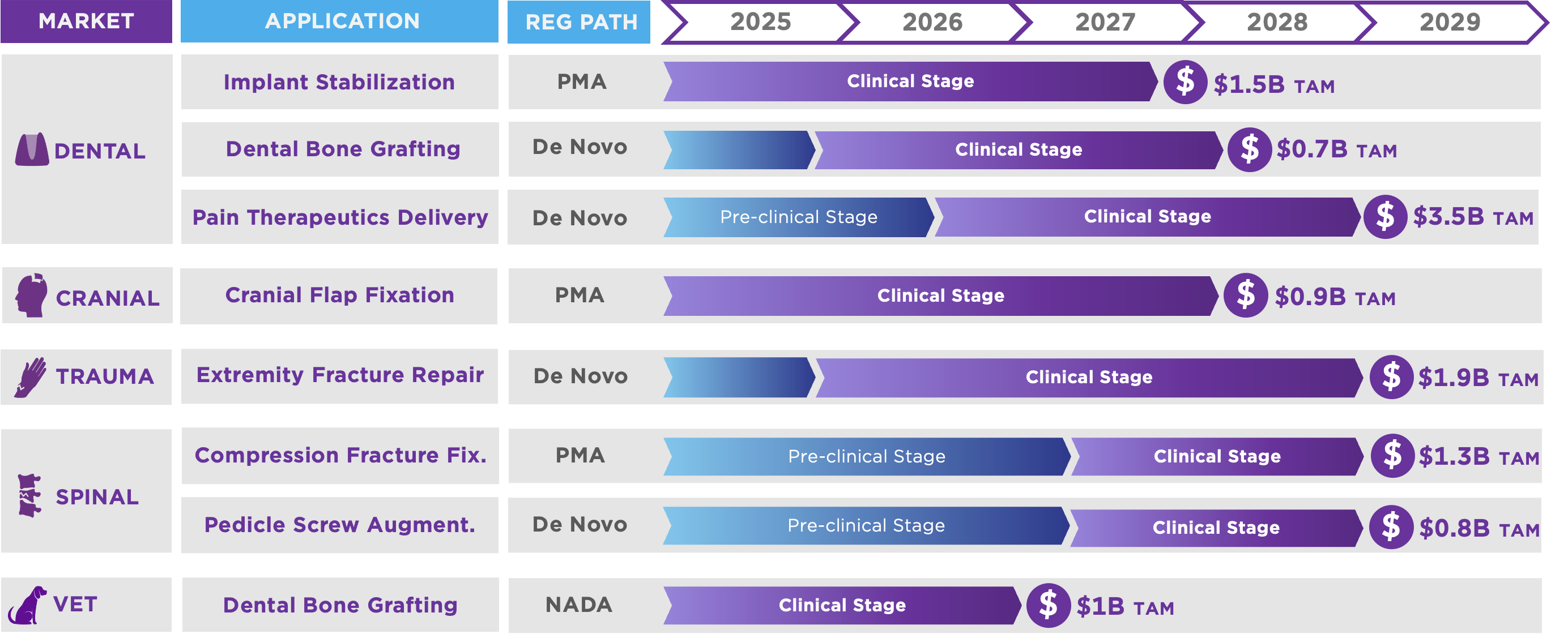 As TETRANITE’s technology is the foundation of a comprehensive novel regenerative bone adhesive platform, RevBio has developed a roadmap for bringing our solutions to market across multiple applications and indications.